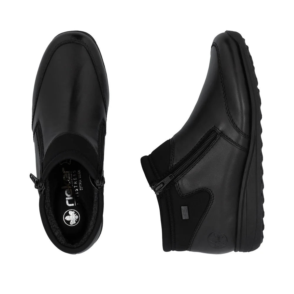 These black Rieker ankle boots are the perfect blend of timeless style and superior comfort. The sleek upper features distinctive textile trim that adds sophisticated detail, while the waterproof membrane keeps your feet dry in any conditions. Dual side zippers ensure effortless on-and-off convenience, leading to a luxuriously soft, removable insole that makes every step a pleasure. Designed with extra room for wider feet, they provide the perfect fit without compromise. These versatile Rieker boots are ideal for women who want practical functionality wrapped in an eye-catching design